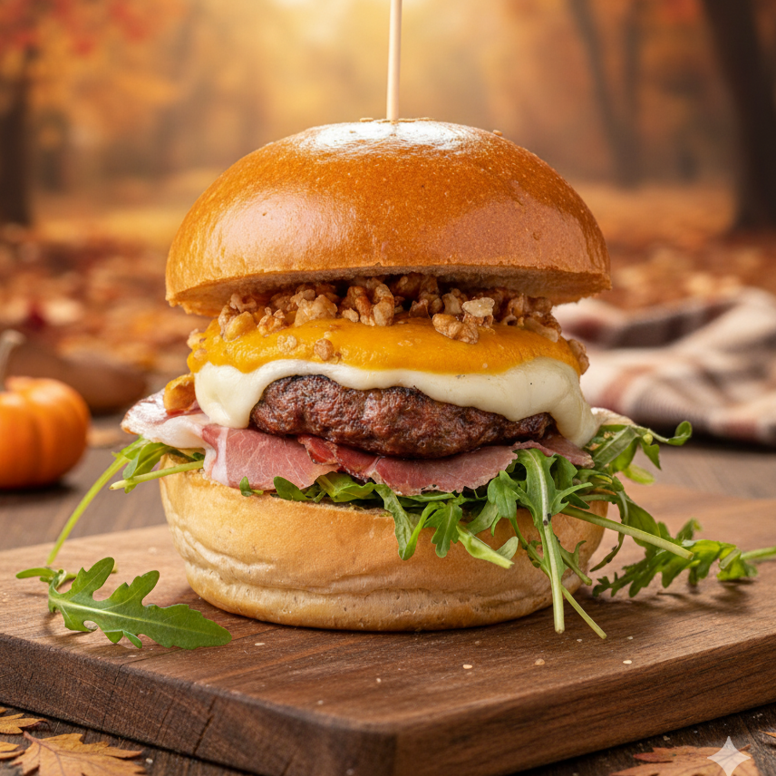 Hamburger di Pollo, Bacon croccante, Funghi trifolati e Crema di Formaggio